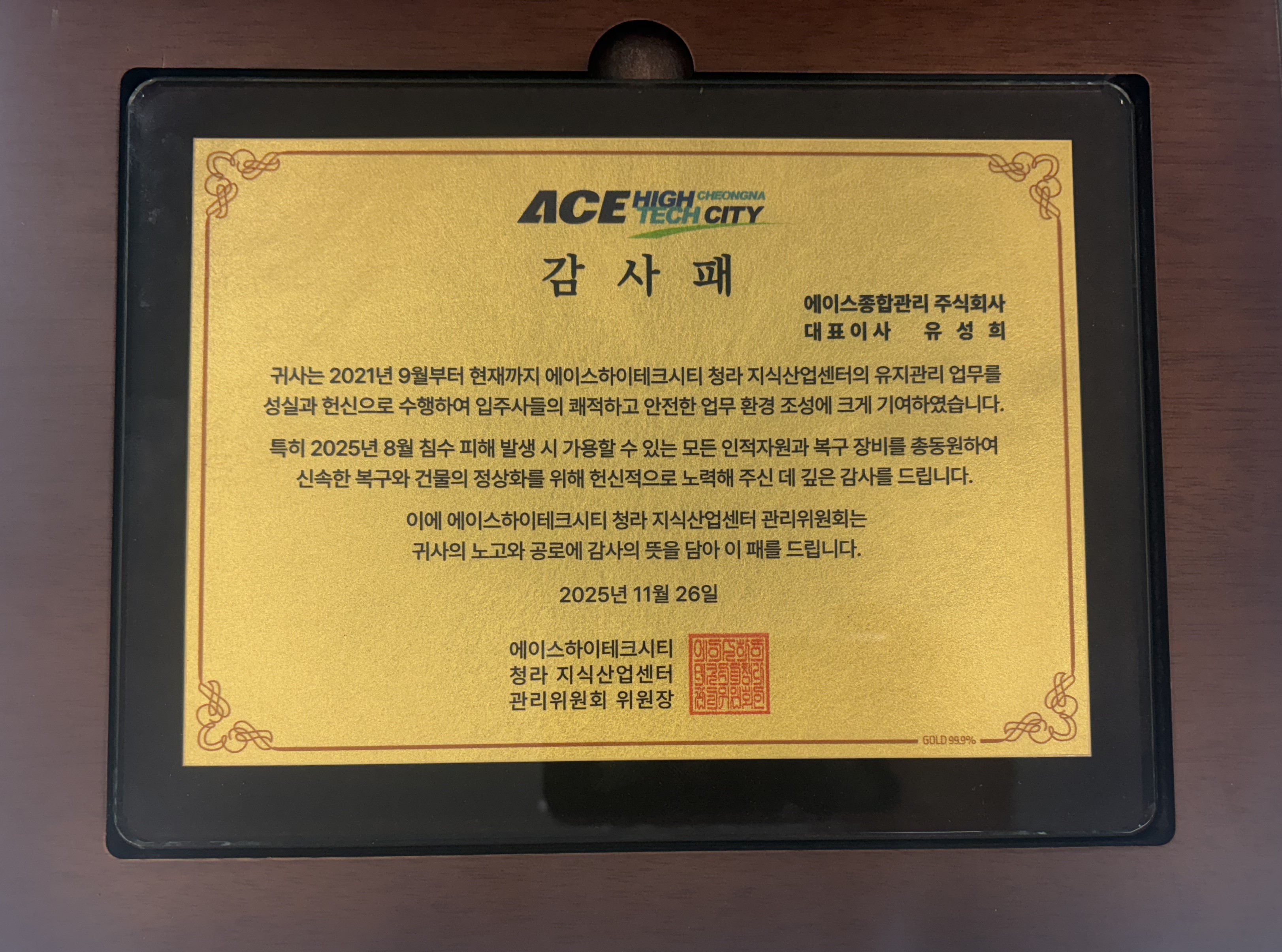에이스테크노타워1차 입주자대표회의 감사패